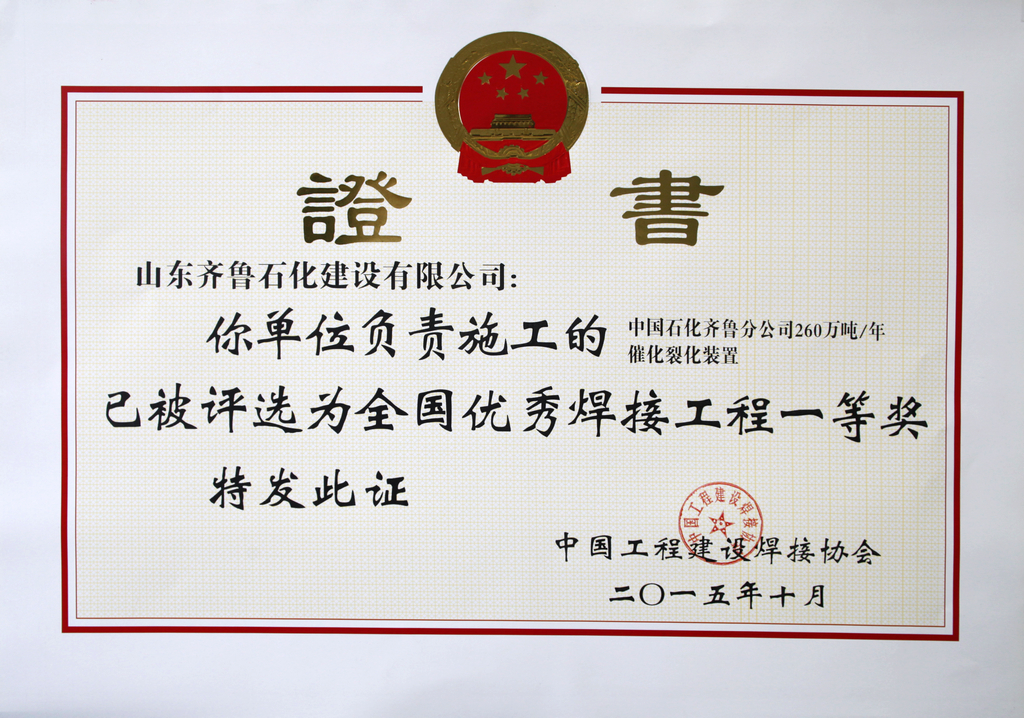 全國優質焊接工程-中國石化齊魯分公司260萬噸/年催化裂化裝置